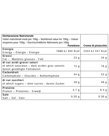 Panettone: Farine de blé tendre, beurre, sucre, œufs frais de poules élevées au sol, couverture de chocolat blanc (10%) (sucre, lait entier en poudre, beurre de cacao, émulsifiant: lécithine de soja, extrait de vanille naturelle), jaune de l’œuf frais de poules élevées au sol, levure naturelle (contient du blé), miel de Sicile, sirop de sucre inverti, pistache (Pistacia vera) (2%), pâte d'orange (zeste d’orange, sucre, sirop de glucose, jus de citron concentré), émulsifiant: mono et diglycèrides d’acides gras, beurre de cacao, lait écrémé en poudre, sel, arôme naturel de vanille. Peut contenir des traces d’autres fruits secs a coque. Crème au pistache: Sucre, pistache (Pistacia vera) (22%), graisses et huiles végétales (huiles de tournesol, beurre de cacao, de carthame), lait écrémé en poudre, lactosérum en poudre, émulsifiant: lécithine de soja, arômes naturels, coloring (curcumine, chlorophylle cuivrique), sel. Peut contenir des traces d’autres fruits secs à coque et farine de lupin.