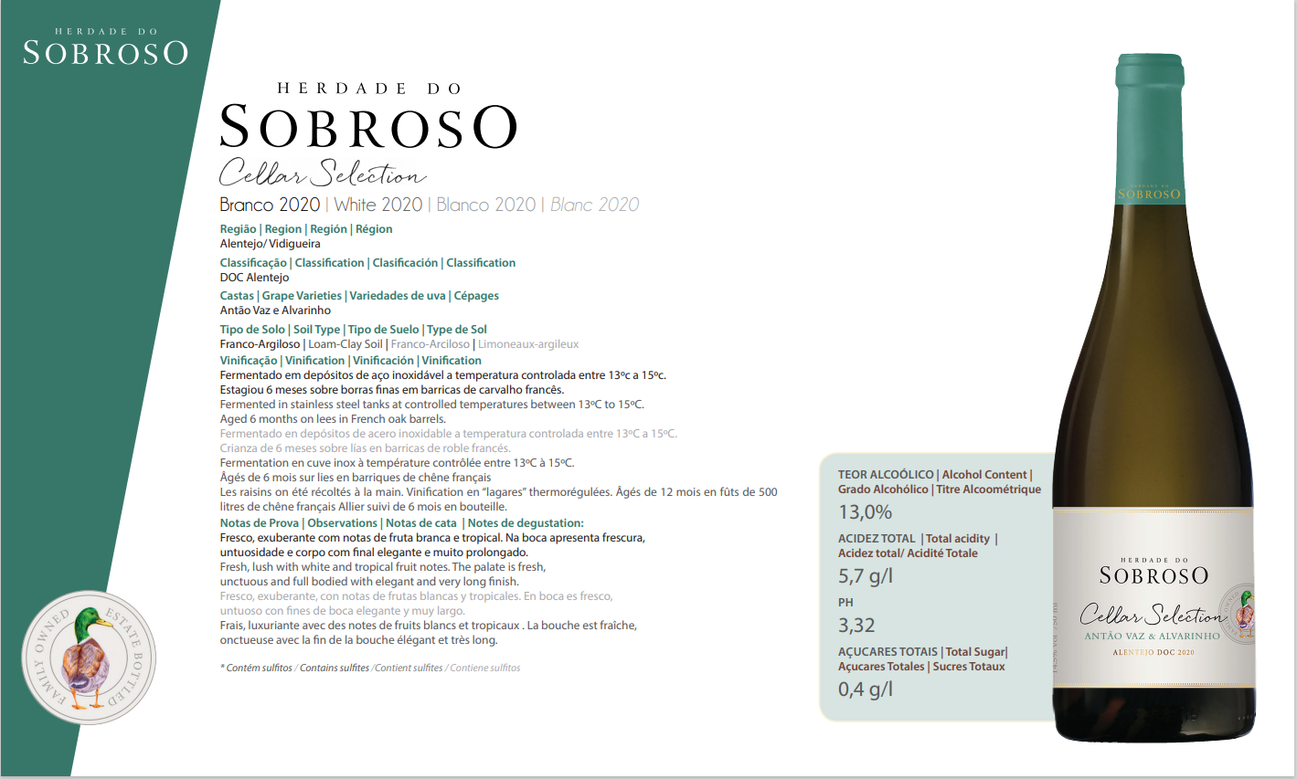Vin Blanc Herdade do Sobroso CELLAR SELECTION 2017, 75CL
