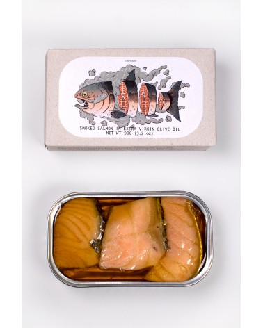 Ingrédients: Saumon (77,8%), huile d’olive extra vierge (20,4%), (fumée naturelle) et sel.