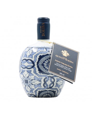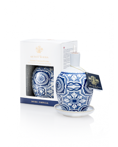 À l'image de leur réputé porto, la Quinta da Boeira se distingue par son engagement envers la qualité, tant dans la production d'huile d'olive que dans la présentation raffinée de ses produits. Une bouteille en porcelaine a été spécialement conçue pour préserver cette huile des influences extérieures, rappelant les traditions anciennes. Ornée d'une scène de tuiles portugaises datant du début du XIXe siècle, cette bouteille devient une œuvre décorative une fois l'huile consommée. Elle peut également être réutilisée pour y verser une recharge d'huile d'olive.