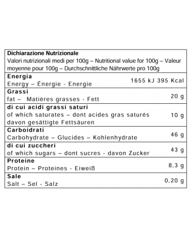 Farine de blé tendre, raisin secs (14%), beurre, sucre, œufs frais de poules élevées au sol, zeste d'orange frais confites (10%) (zeste d'orange, sucre, jus de citron concentré), jaune de l’œuf frais de poules élevées au sol, levure naturelle (contient du blé), “vino Marsala AOP” (1,8%), miel de Sicile, sirop de sucre inverti, pâte d'orange (zeste d'orange, sucre, sirop de glucose, jus de citron concentré), émulsifiant: mono et diglycérides d'acides gras, “Terre Siciliane Zibibbo liquoroso IGP” (0,4%), beurre de cacao, lait écrémé en poudre, sel, arômes naturels: baies de vanille. Peut contenir des traces de fruits secs à coque et soja.