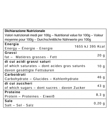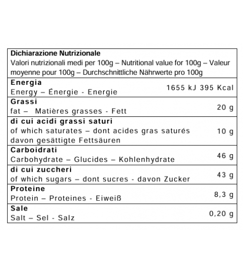 Farine de blé tendre, raisin secs (14%), beurre, sucre, œufs frais de poules élevées au sol, zeste d'orange frais confites (10%) (zeste d'orange, sucre, jus de citron concentré), jaune de l’œuf frais de poules élevées au sol, levure naturelle (contient du blé), “vino Marsala AOP” (1,8%), miel de Sicile, sirop de sucre inverti, pâte d'orange (zeste d'orange, sucre, sirop de glucose, jus de citron concentré), émulsifiant: mono et diglycérides d'acides gras, “Terre Siciliane Zibibbo liquoroso IGP” (0,4%), beurre de cacao, lait écrémé en poudre, sel, arômes naturels: baies de vanille. Peut contenir des traces de fruits secs à coque et soja.